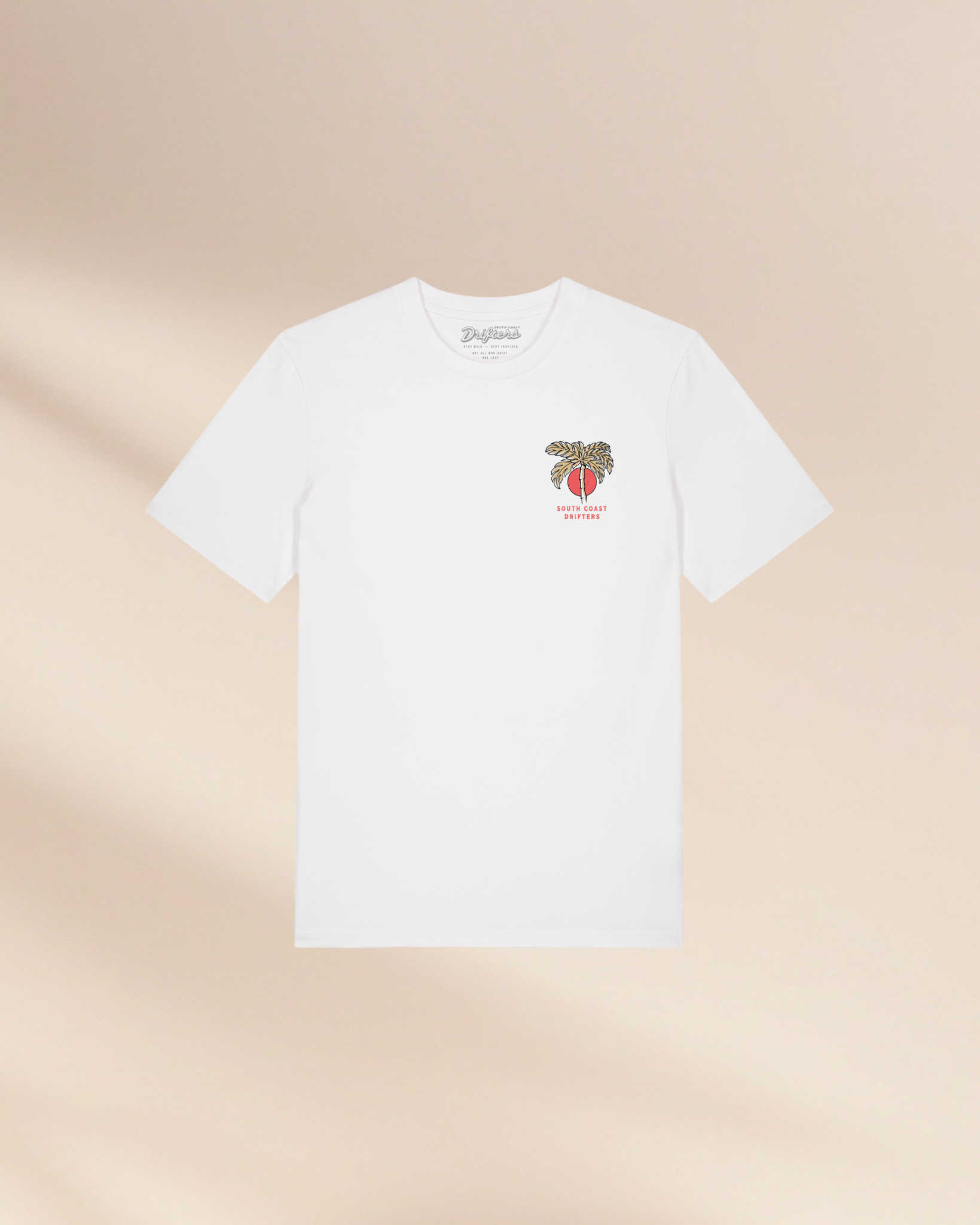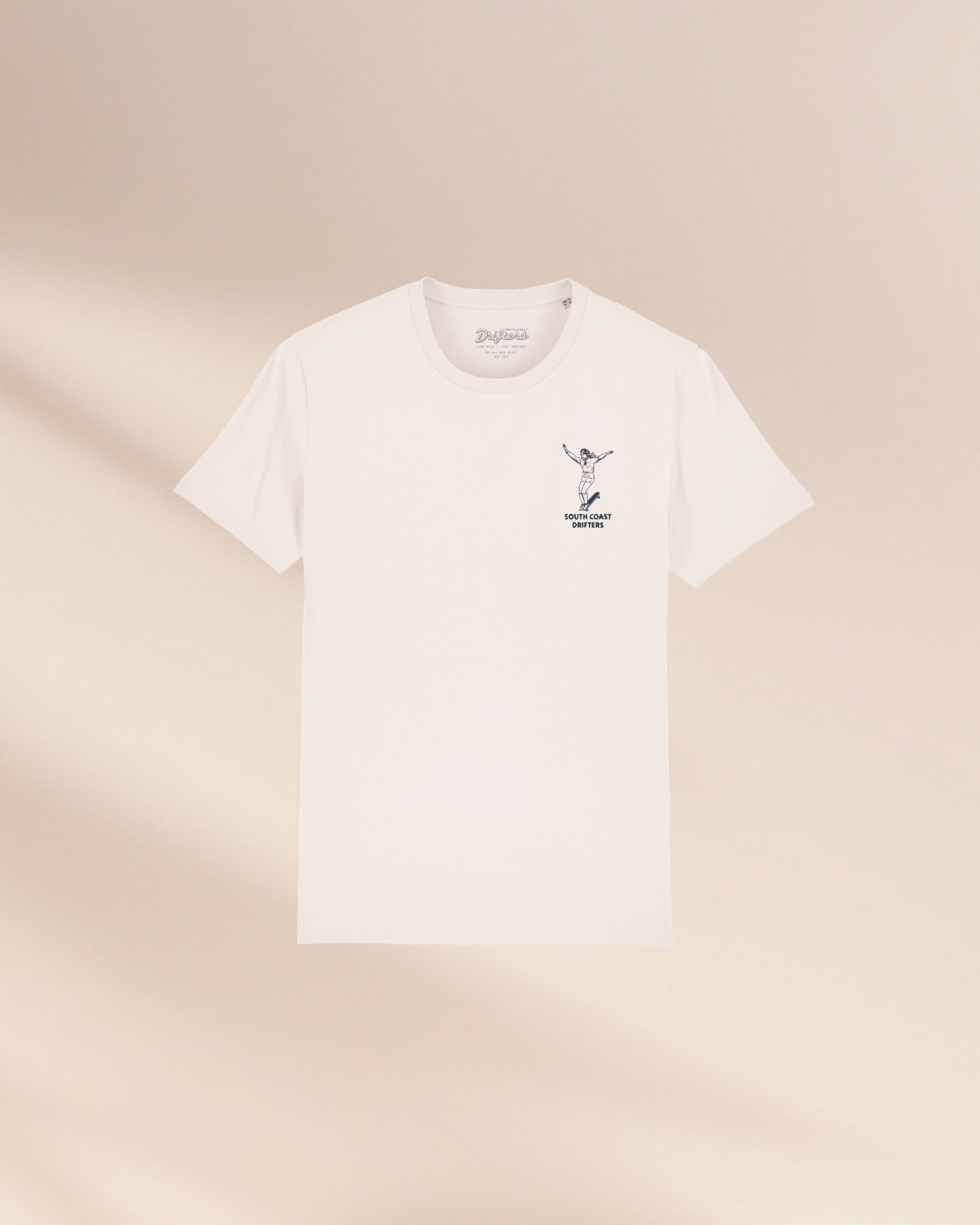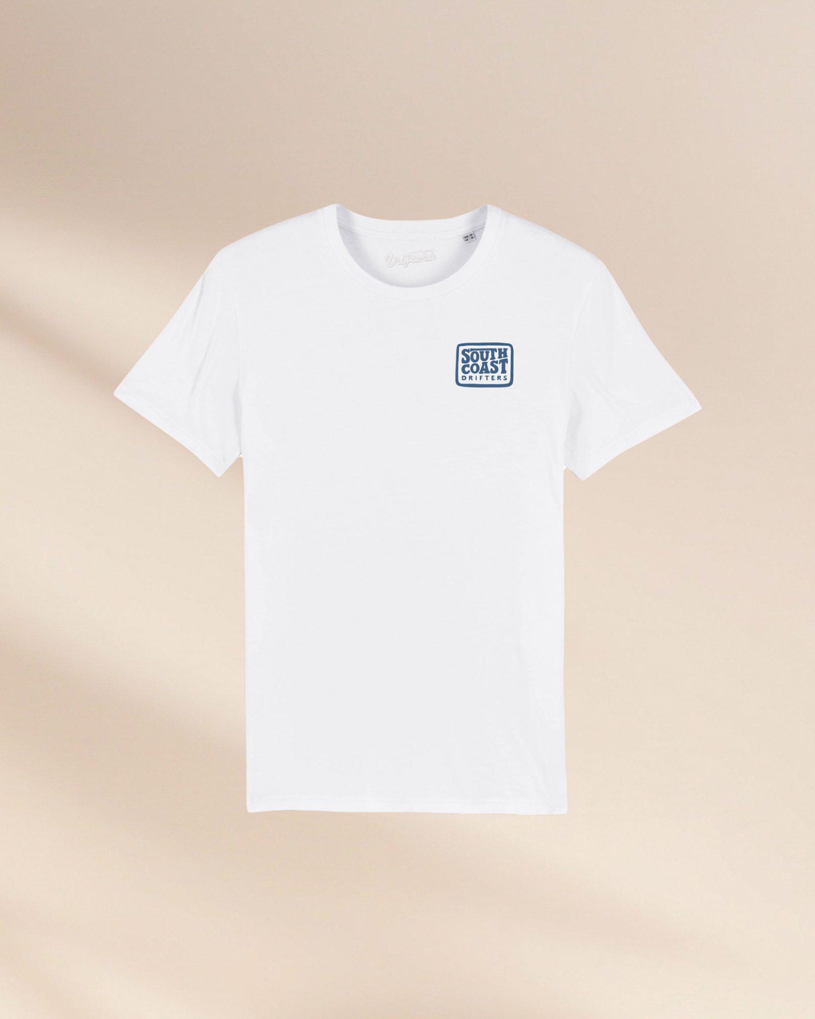 Big Drifter White T-Shirt Man facing away wearing white South Coast Drifters tee with logo print. Man in white tee with South Coast Drifters chest logo, khaki shorts. Girl facing away wearing white South Coast Drifters tee with logo print. Girl in white tee with South Coast Drifters chest logo. Man facing away wearing white South Coast Drifters tee with logo print. Girl facing away wearing white South Coast Drifters tee with logo print.