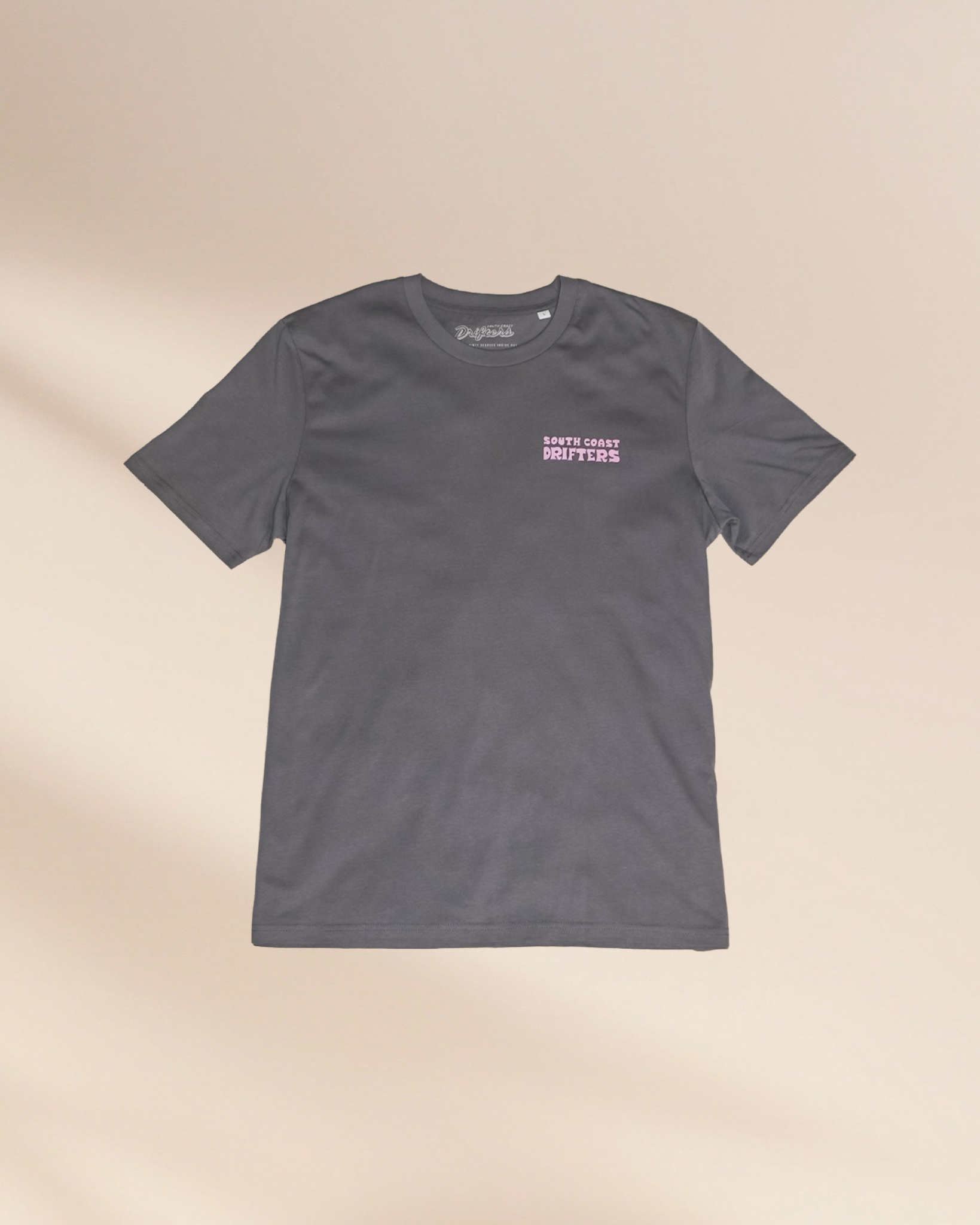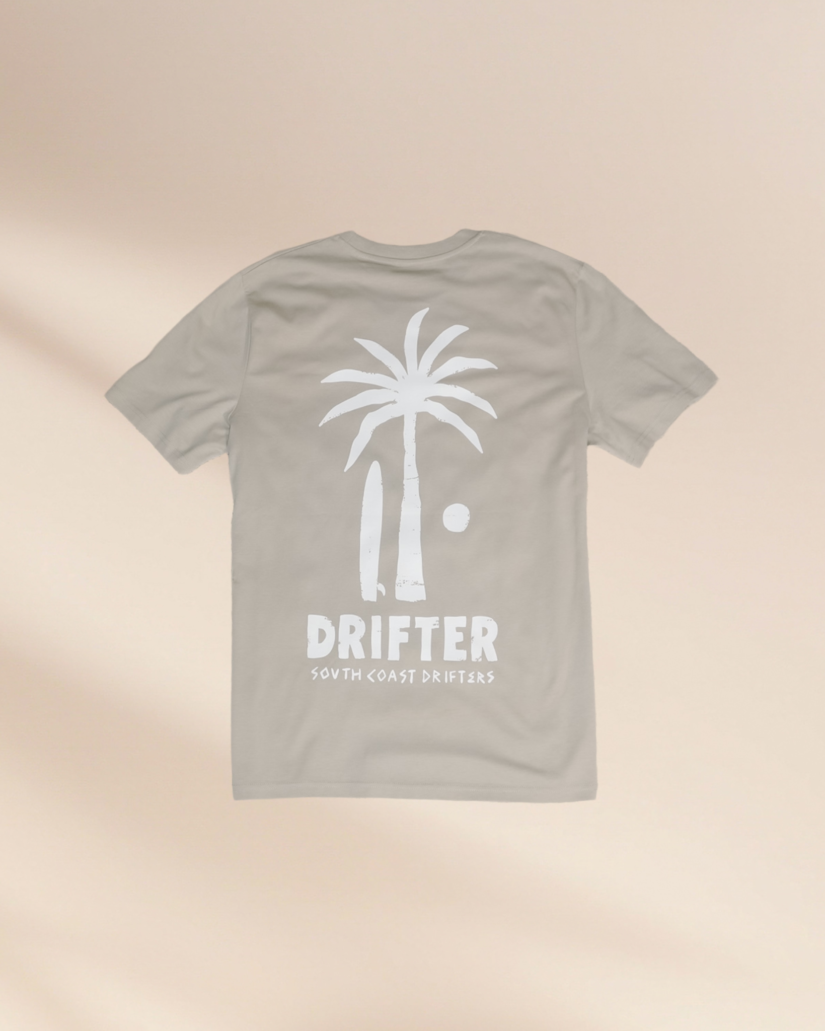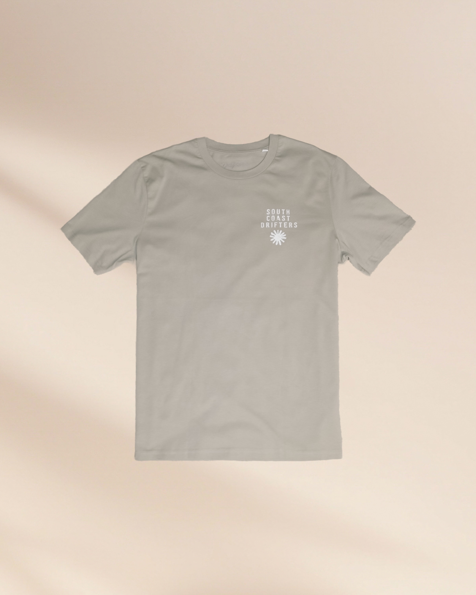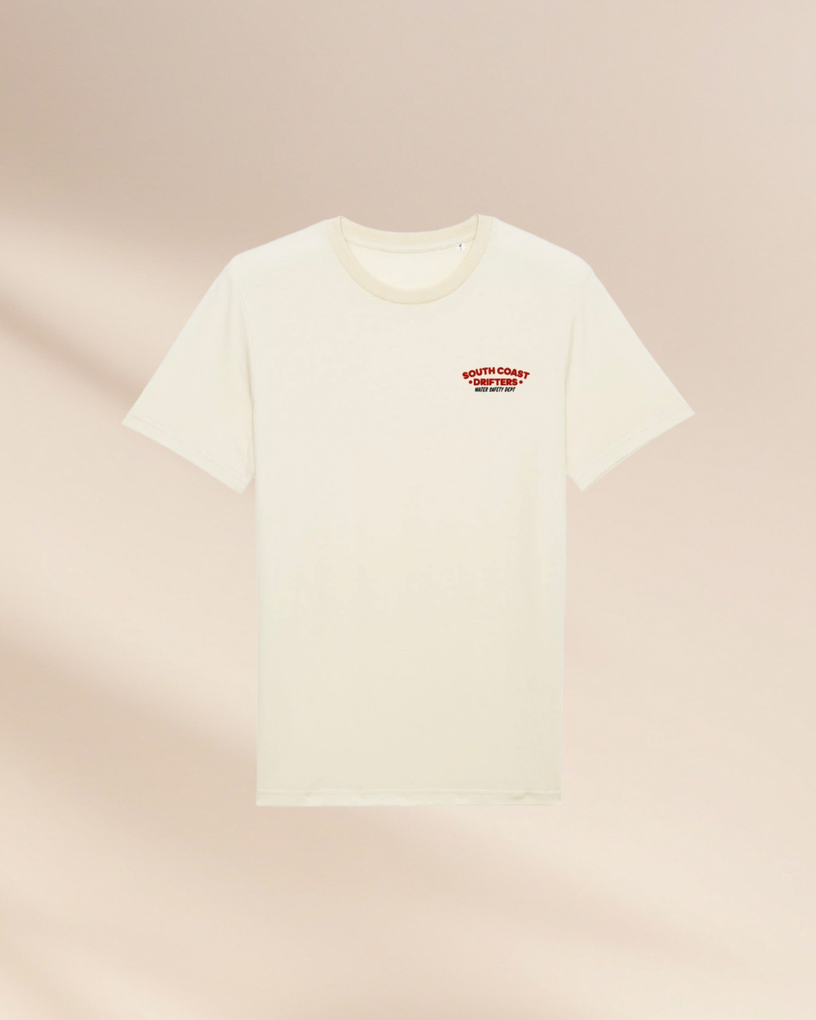 Big Drifter White T-Shirt Man facing away wearing white South Coast Drifters tee with logo print. Man in white tee with South Coast Drifters chest logo, khaki shorts. Girl facing away wearing white South Coast Drifters tee with logo print. Girl in white tee with South Coast Drifters chest logo. Man facing away wearing white South Coast Drifters tee with logo print. Girl facing away wearing white South Coast Drifters tee with logo print.