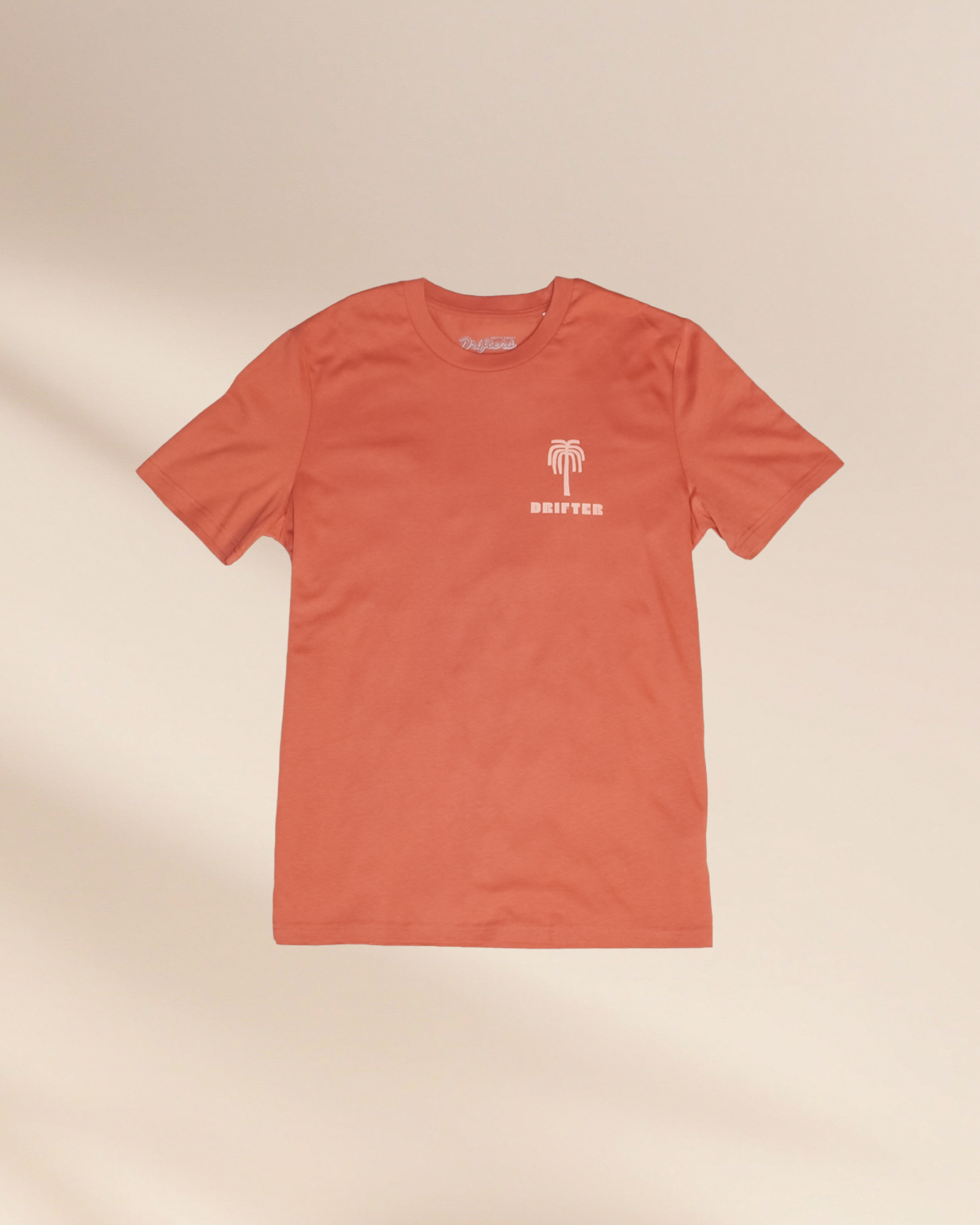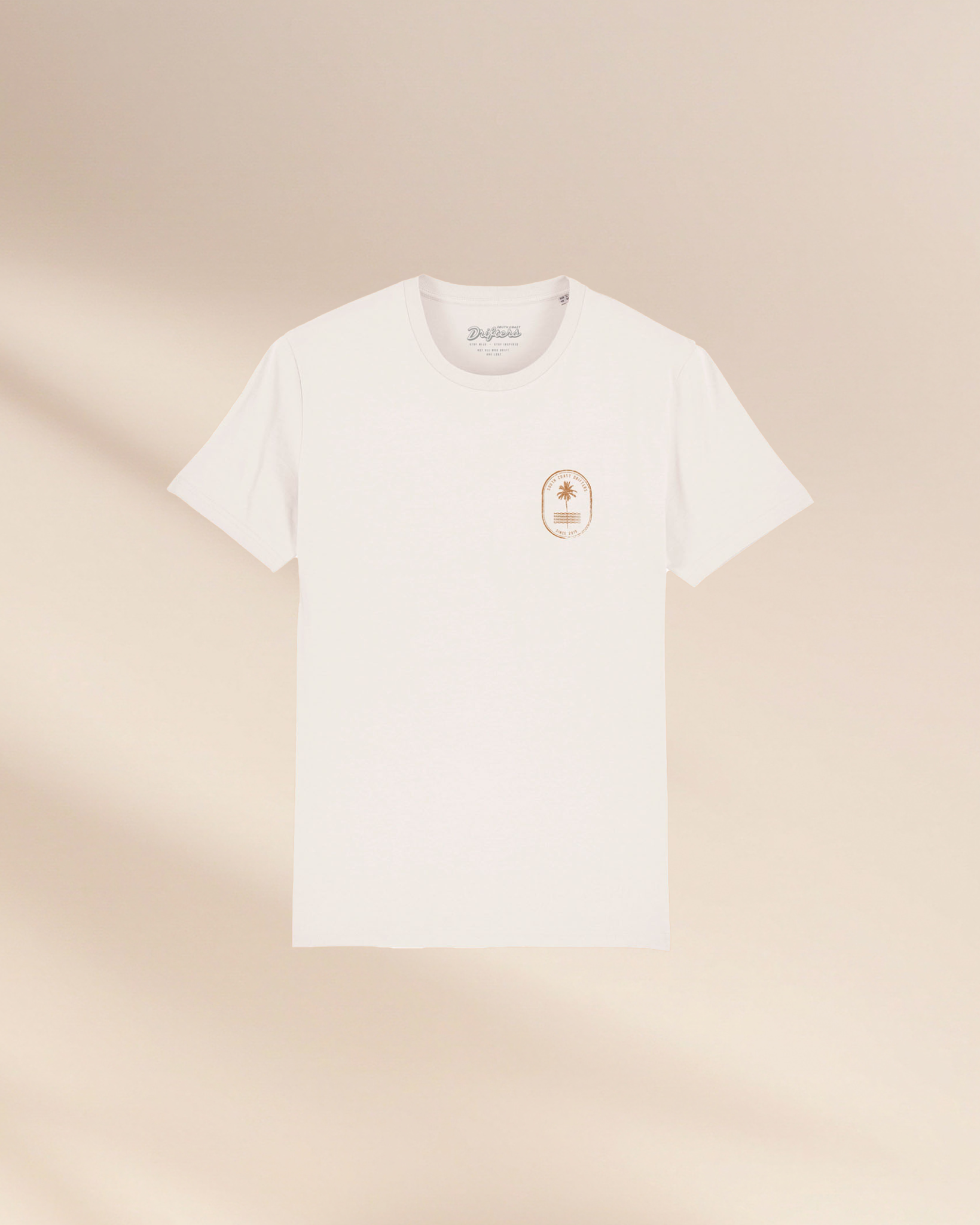 Palm Vintage White T-Shirt "Man in white tee with palm print, khaki shorts, and sneakers." "Man in white tee with palm print, khaki shorts, and sneakers." Back view of white Palm Vintage tee with burnt orange palm tree print. Front view of woman in white tee with small palm logo. Woman in white Palm Vintage tee and blue jeans leaning against a wall. Person in white tee with burnt orange palm design standing against a wood wall. Front view of woman in white tee with small palm logo.