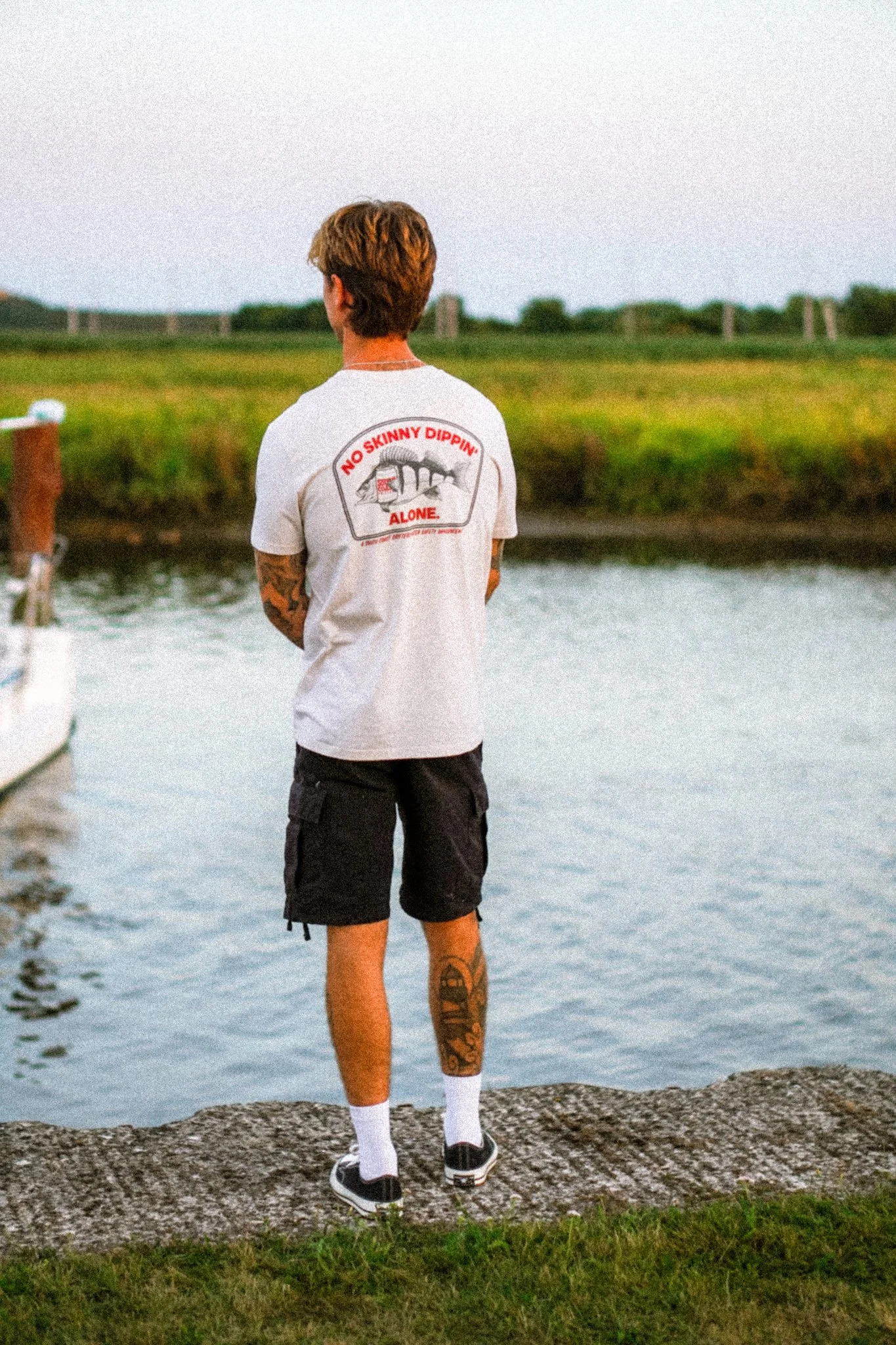 No Skinny Dippin Alone T-Shirt Woman wearing 'No Skinny Dippin' Alone' printed white T-shirt. Casual white tee with humorous safety message on back. Close-up of 'No Skinny Dippin' Alone' T-shirt front print Close-up of 'No Skinny Dippin' Alone' T-shirt back print. Woman wearing 'No Skinny Dippin' Alone' printed white T-shirt.
