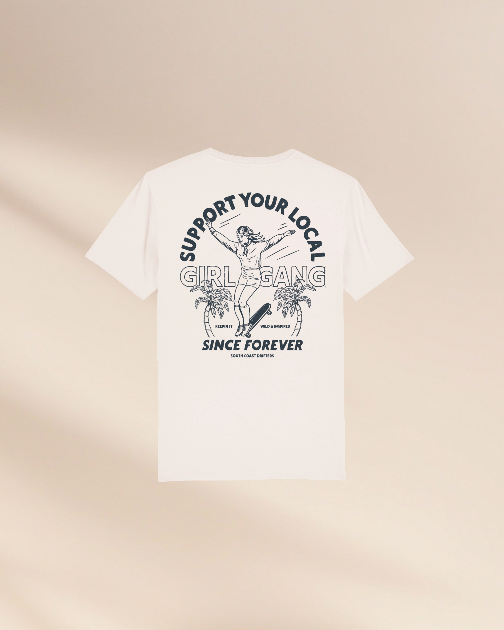 Girl Gang II Pink T-Shirt Alt Text: A woman's back, wearing a South Coast Drifters Cotton Pink 'Girl Gang II' T-shirt with a 'Support Your Local Girl Gang' print surrounded by palm illustrations. Woman in a café wearing South Coast Drifters' pink logo tee. Alt Text: A woman's back, wearing a South Coast Drifters Cotton Pink 'Girl Gang II' T-shirt with a 'Support Your Local Girl Gang' print surrounded by palm illustrations. Woman in a café wearing South Coast Drifters' pink logo tee. Woman in a café wearing South Coast Drifters' pink logo tee. Alt Text: A woman's back, wearing a South Coast Drifters Cotton Pink 'Girl Gang II' T-shirt with a 'Support Your Local Girl Gang' print surrounded by palm illustrations. Woman in a café wearing South Coast Drifters' pink logo tee.